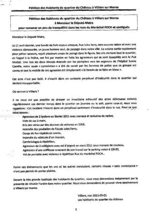 « J’habite Villiers depuis 1995, dans le quartier des Luats et depuis 2002, je suis dans le quartier du Château. La commune a énormément changée, un nouveau centre-ville, de nouveaux immeubles, une déserte RER améliorée etc. Ceci afin d’attirer de nouveaux Villiérains. Je pense que la municipalité a échoué pour faire venir de nouveaux locataires, nous avons une fiscalité élevée, une insécurité grandissante, surtout vers la gare et des agressions violentes à l’égard des habitants. Je vais suivre vos actions et vos commentaires à travers votre revue, mais avant de vous quitter, j’aimerai vous parler de cette agression qui s’est produite dans la rue Jules Ferry lundi 11 avril vers 21h00.