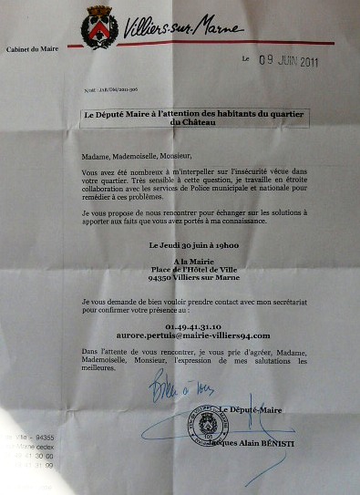 JA Benisti, déjà entré en campagne électorale en vue des législatives de juin 2012, a distribué mardi 14 juin, une lettre aux habitants du Château pour les convier à une réunion le 30 juin en Mairie.