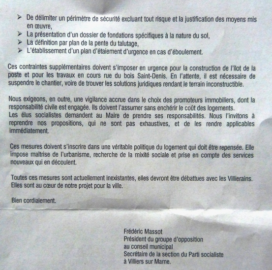 Dernier signe de la mobilisation, les élus socialistes au conseil municipal viennent de distribuer un tract intéressant qui a le mérite de rappeler les obligations du maire et sa responsabilité au cours d l’instruction des permis de construire. Nous le reproduisons ci-dessous.