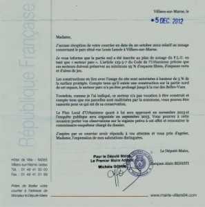 La réponse faite par la mairie à la demande d’une riveraine que vous trouverez ci-dessous semble indiquer que la mairie ne saurait faire obstacle à la protection de cette parcelle