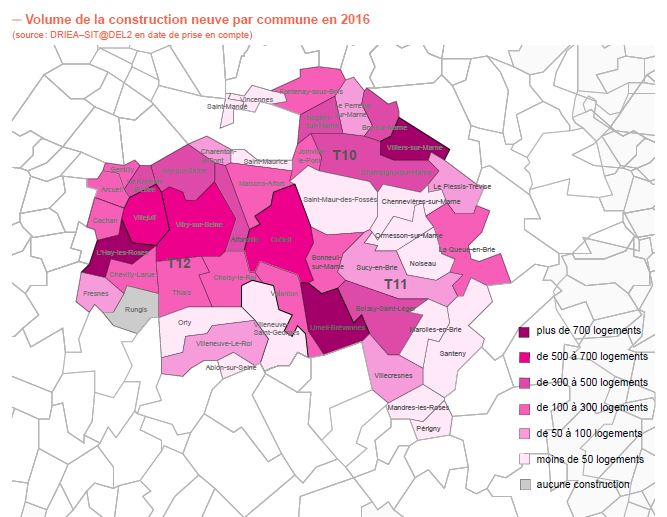 Alors que les projets de logements se développement tous azimuts autour des futures gares du Grand Paris Express, 2016 a vu la mise en chantier de 60 686 logements en Ile-de-France dont 9 419 en Val-de-Marne, pas loin de l’objectif des 70 000 logements par an dans la région. Après une baisse en 2013 et 2014 sous le seuil des 5 000 mises en chantier, 2015 a explosé le record avec 9 493 mises en chantier et 2016 a réussi à progresser encore à 9 419. « Six communes ont accueilli plus de 500 nouveaux logements en 2016 et rassemblent 43% de la production : L’Haÿ-les-Roses (864), Villiers-sur-Marne (775), Limeil-Brévannes (763), Villejuif (628), Vitry-sur-Seine (507) et Créteil (501) », détaille l’Adil. Sur les 9 419 mises en chantier de 2016, 1 565 concernent des logements en résidences, soit 17% de l’ensemble. »